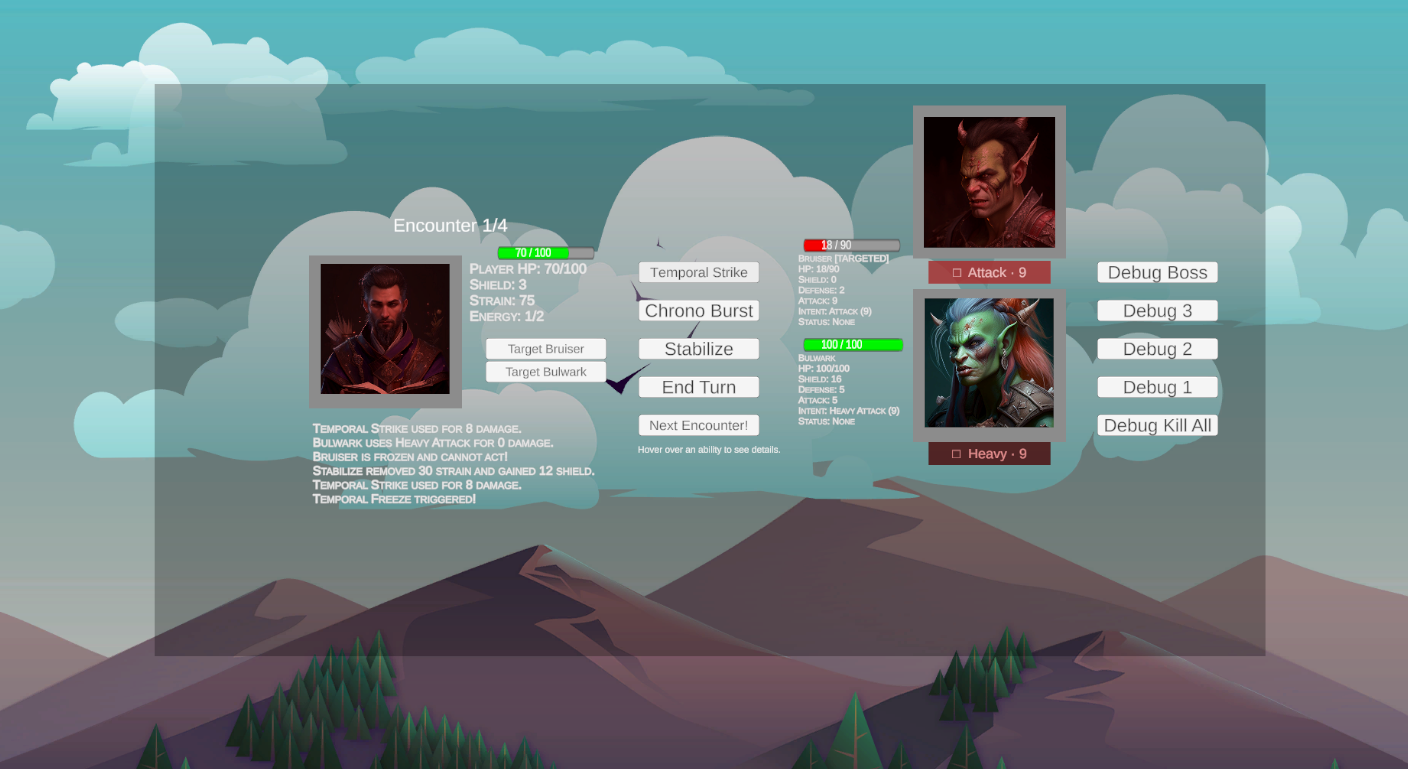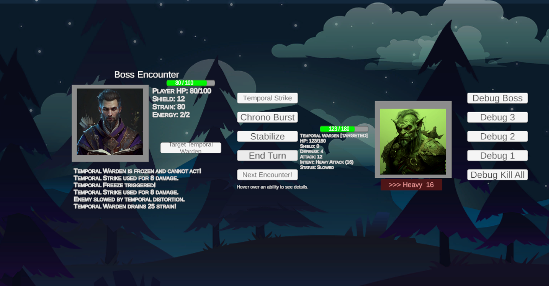 The Temporal Warden The final encounter is unlike anything before it. The Warden descends alone, regenerates shield every turn, and targets your Strain directly, draining the temporal power you've worked to accumulate. At 50% health he enrages, unlocking Warden Surge — a devastating strike that hits hard and simultaneously rebuilds his shield. When he uses it, you're not just taking damage, you're losing ground. Combine that with his Strain Drain ability stripping away your accumulated power, and Phase 2 becomes a race against your own resources.